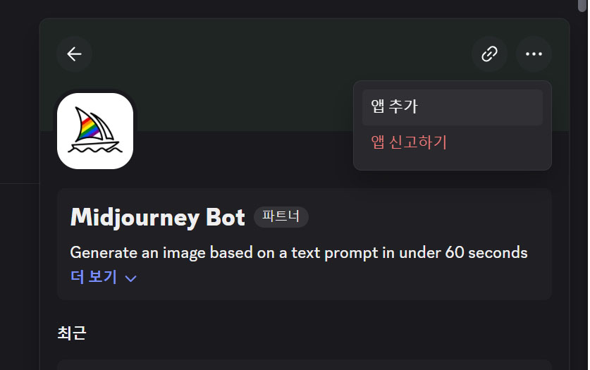 - 미드저니 클릭(왼쪽 미드저니 돗 모양) / 우측하단 아이콘(게임 콘트롤 모양) 클릭 / 우측  ● ● ● 클릭 앱추가 / 서버에 추가 / 서버 선택('AI 숏츠 전용 미드저니 서버' ) / 계속하기 / 승인 클릭
