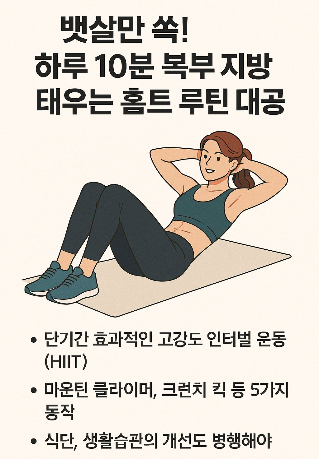 뱃살은 가장 빼기 어려운 부위지만, 가장 큰 변화의 시작점이기도 합니다. 오늘 하루, 단 10분만이라도 자신에게 투자해보세요. 몸도 가벼워지고, 자신감도 되찾게 될 것입니다.