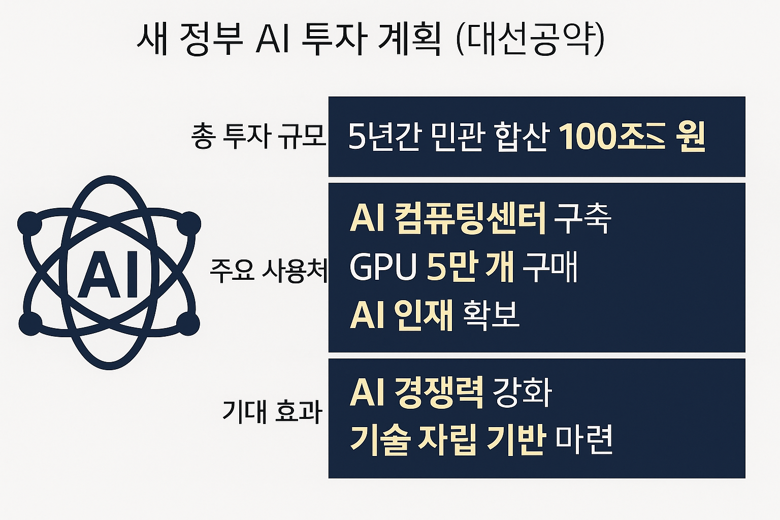 주요 사용처: AI 컴퓨팅 센터 구축, GPU 5만개 구매, AI인재 확보, 기대효과: AI경쟁력 강화, 기술 자립 기반 마련