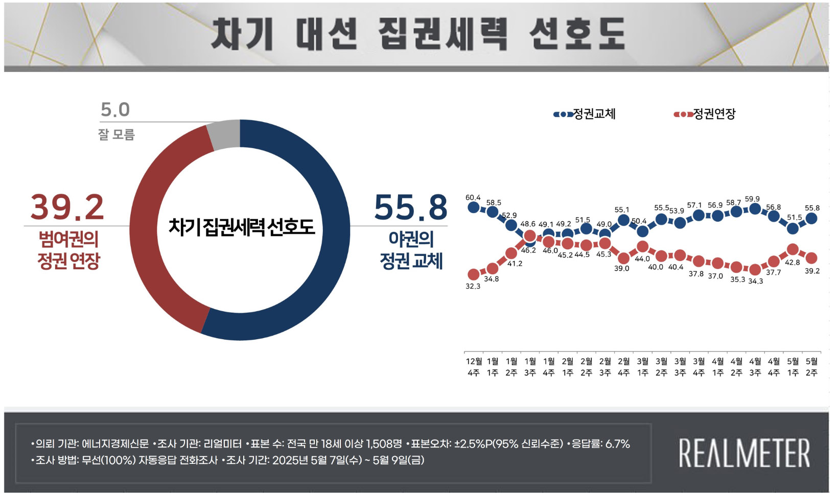 이번 리얼미터 조사에서 주목할 점은 **정권 교체를 원하는 응답자 비율이 55.8%**에 달했다는 점입니다. 이는 지난 조사보다 4.3%p 상승한 수치로, 정권에 대한 피로감이나 실망이 일정 부분 반영된 것으로 해석됩니다. 반면, 정권 유지 희망 여론은 39.2%로 하락했습니다.